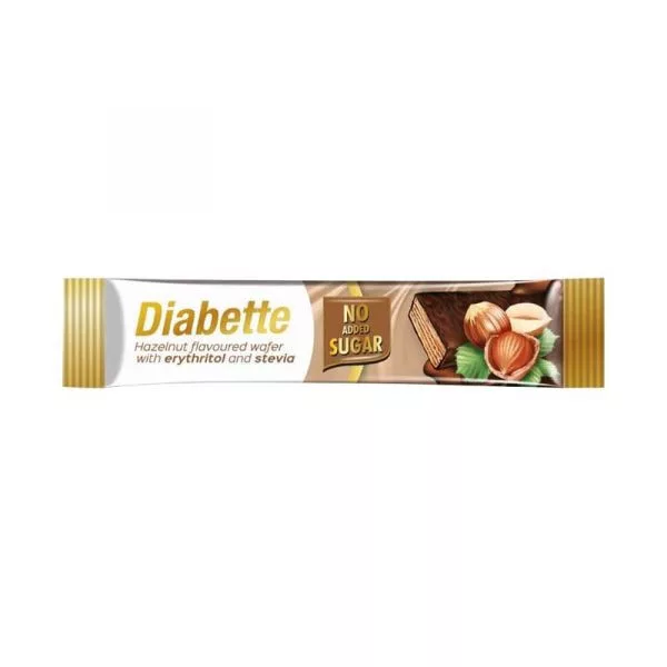 NAS Diabette mogyoróízű krémmel töltött ostya szelet, kakaós étbevonó masszával mártva, hozzáadott cukor nélkül, édesítőszerekkel (eritrittel és steviával).