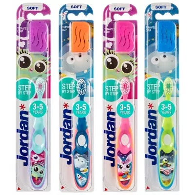 Jordan gyerek fogkefe 3-5 éves korig. Kimondottan a tejfogak tisztítására tervezve és a szükséges fogkrém mennyiségét jelző színes sörtékkel ellátva.