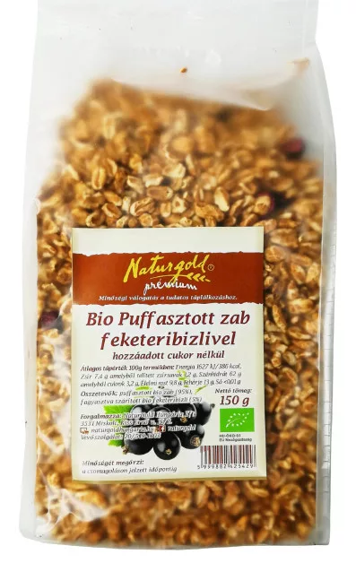Összetevők: Puffasztott zab* (95%). Fagyasztva szárított feketeribizli* (5%).